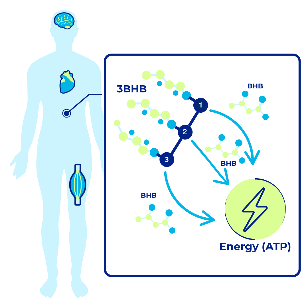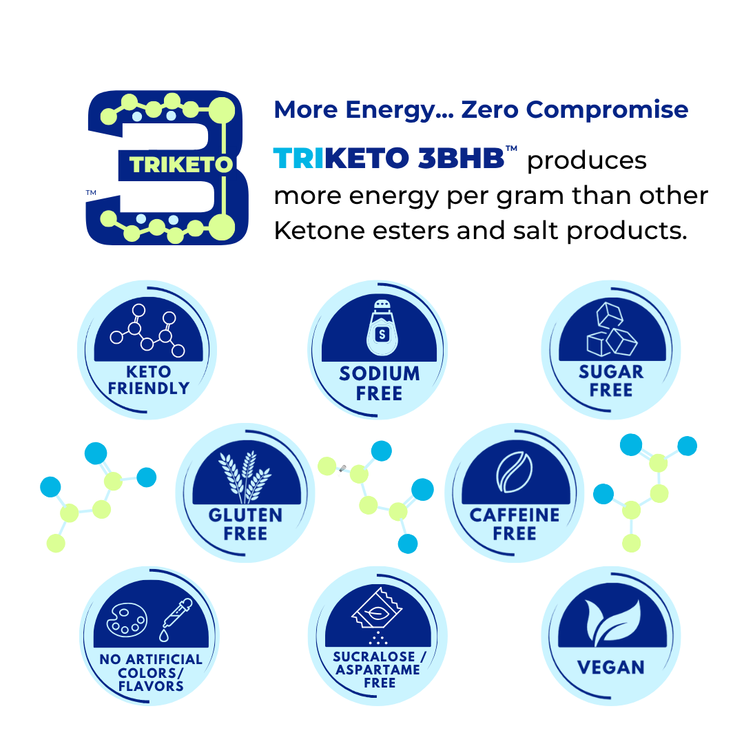 Many Ketone products can’t deliver a significant increase in blood Ketone levels, or some drop too quickly. Triketo 3BHB™ is a Tri-Ester, which means you get 3 BHBs in every molecule of Triketo 3BHB™ to produce more energy in the body to keep you going longer.