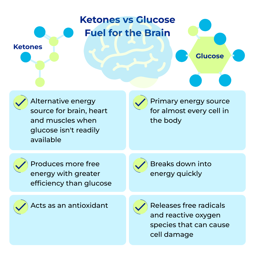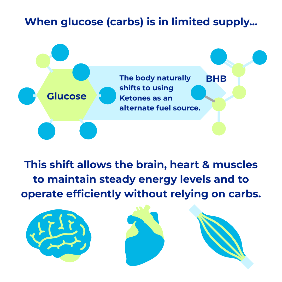 When glucose (via carbohydrates) is in limited supply, the body naturally shifts to using Ketones as an alternative fuel source, tapping into fat stores to help maintain steady energy levels. This shift allows the brain, muscles, and heart to operate efficiently without relying on carbohydrates.