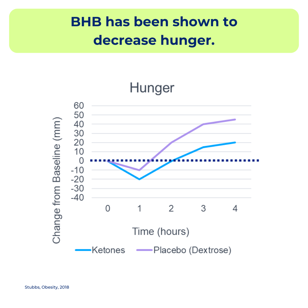 BHB plays a powerful role in appetite control by directly influencing hunger hormones and brain signaling. Unlike glucose, Ketones act not just as fuel, but as signaling molecules to peptides that affect how we feel hunger and fullness. Elevated BHB levels have been shown to suppress ghrelin (the "hunger hormone") and enhance the effects of leptin and GLP-1, both of which promote satiety (a feeling of fullness). BHB can also make intermittent fasting or low-calorie diets more tolerable. Studies suggest that combining ketogenic diets and exogenous Ketone supplements can help curb hunger and activate peptide hormones—sometimes even more effectively than calorie restriction alone.