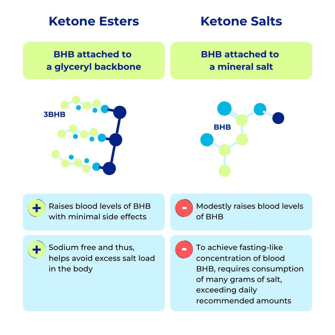Ketone Esters and Ketone salts both provide exogenous Ketones to support the body’s transition into ketosis, but they differ in composition and effectiveness.